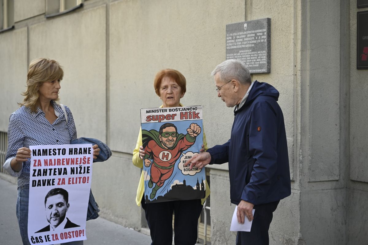 Protestniki zahtevajo pravičen zdravstveni prispevek, finančnega ministra Boštjančiča pa pozivajo k odstopu. Na enem od transparentov z Boštjančičevo podobo piše: Namesto hrane za najrevneše zahteva nižje davke za elito!