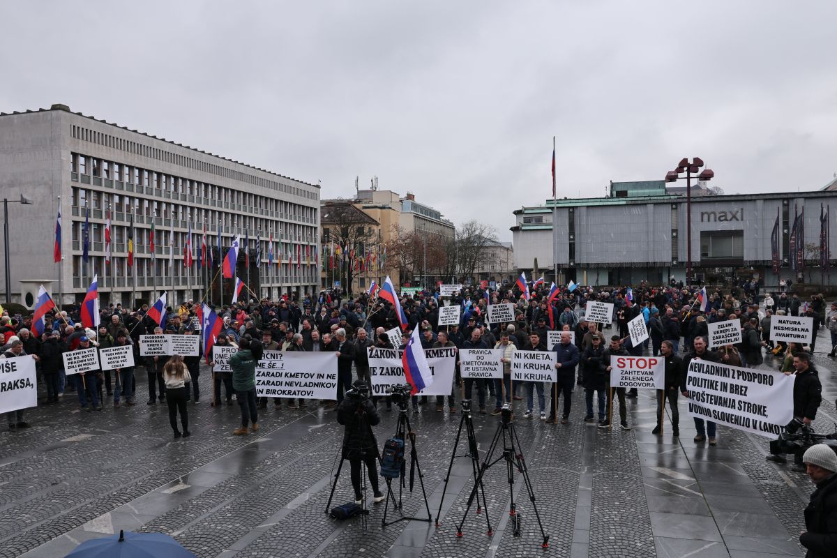 Udeleženci današnjega kmečkega protesta, zbrani pred poslopjem DZ v Ljubljani, so vnovič izrazili nestrinjanje z vladnimi ukrepi na področju kmetijstva. "Zahtevamo spoštovanje do našega dela in da nas jemljejo resno," so med drugim poudarili protestniki.