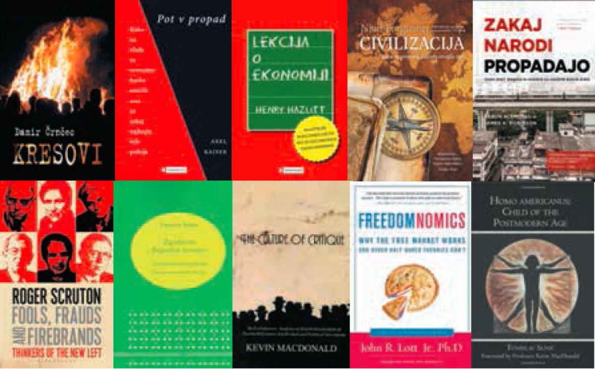 Ker so bralci Reporterja vendarle nadpovprečno izobraženi in najbolj zahtevne zadeve razumejo tudi v angleščini, še nekaj tujih naslovov, ki so dostopni na (ja, neoliberalnem) Amazonu: Culture of Critique Kevina B. MacDonalda, Freedomnomics Johna R. Lotta, Homo Americanus Tomislava Sunića, The Closing of the Muslim Mind Roberta R Rilleyja in Fools, Frauds and Firebrands Rogerja Scrutona.