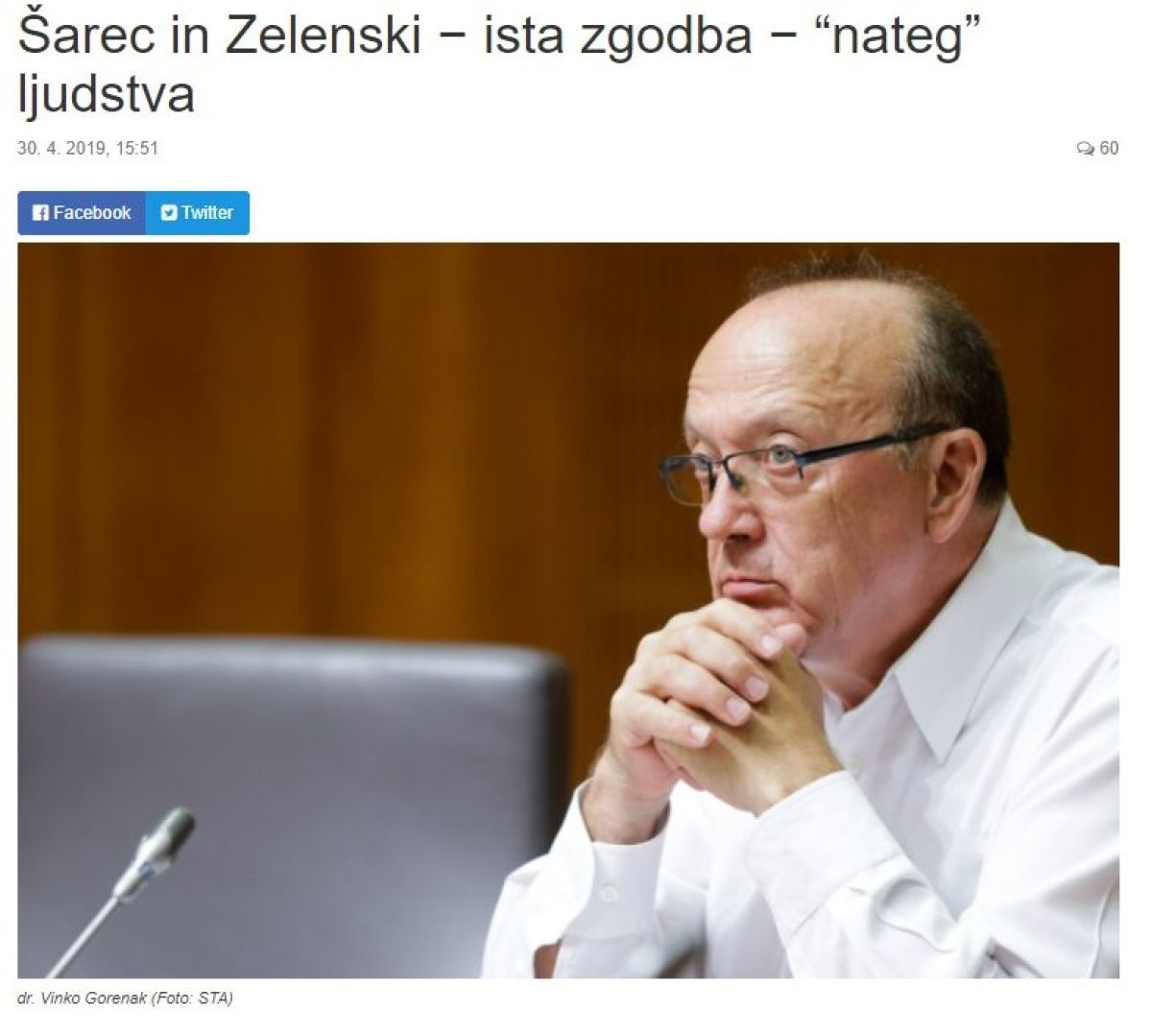 »Šarec in Zelenski − ista zgodba – 'nateg' ljudstva,« je sekretar v Janševem kabinetu Vinko Gorenak v kolumni za portal Nova24TV pisal o tedaj novoizvoljene ukrajinskem predsedniku – ni ga torej primerjal z Janšo, temveč z v SDS preziranim takratnim predsednikom slovenske vlade Marjanom Šarcem. »Dva igralca sta igrala dva prva moža svoje države, volivci pa so jima nasedli in ju na volitvah postavili na mesto, ki sta ga igrala,« je povzel njuno podobnost.