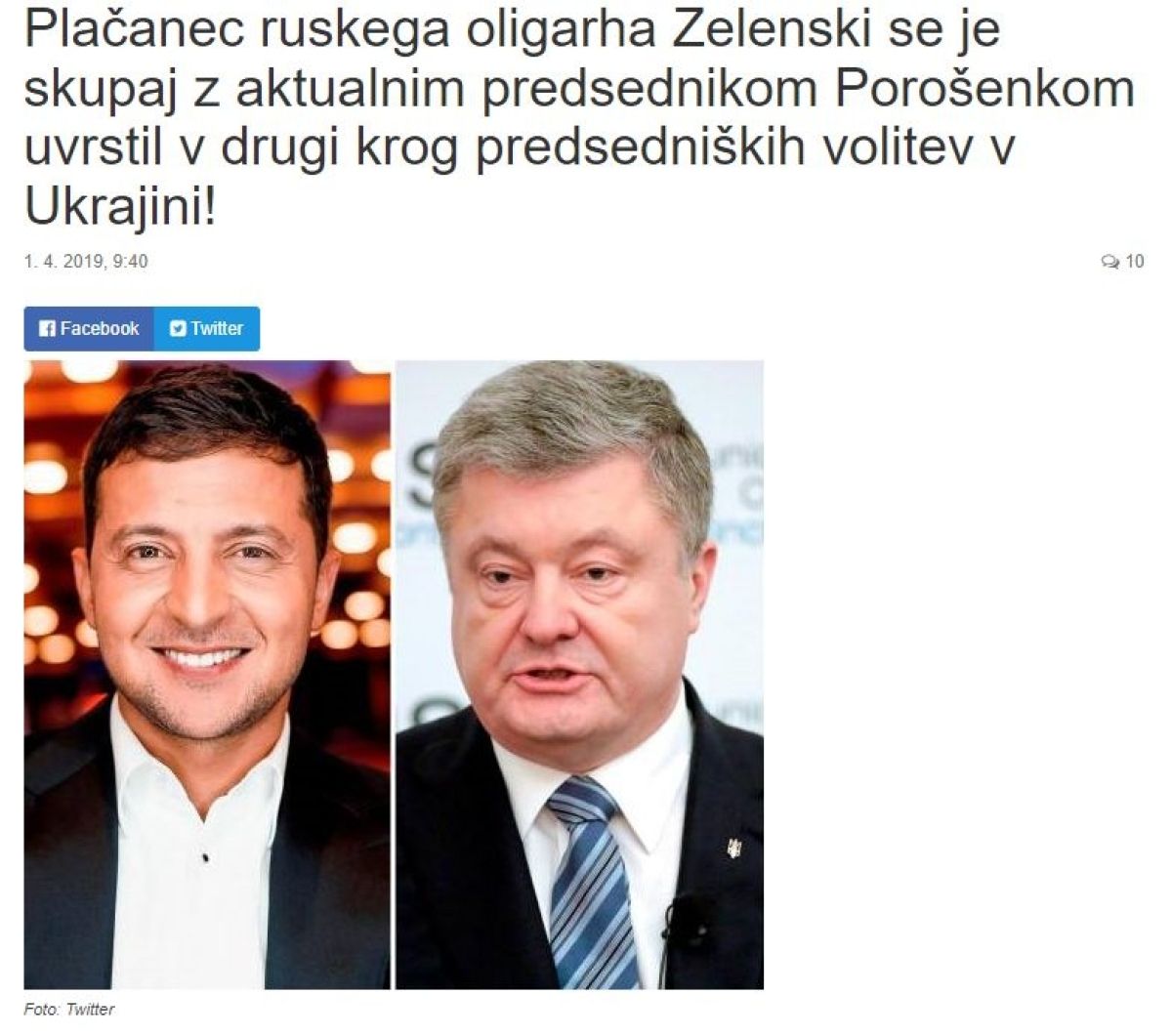 Še huje so se Zelenskega lotili v drugih prispevkih na Nova24TV. Očitali so mu, da je plačanec ruskega oligarha Igorja Komojskega in lutka v rokah nasprotnikov dotedanjega ukrajinskega predsednika Petra Porošenka. »Ukrajina dobila svojega Šarca: Komik brez političnih izkušenj in ruski plačanec bo predsednik!« je bil na portalu naslov članka o izvolitvi Zelenskega.