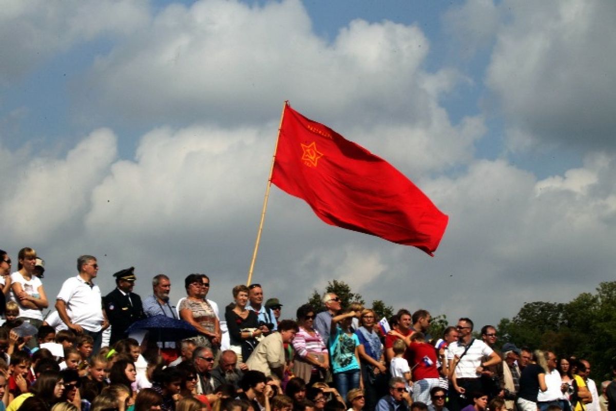 Komunistične zastave in rdeče zvezde na proslavi priključitve Primorske Sloveniji