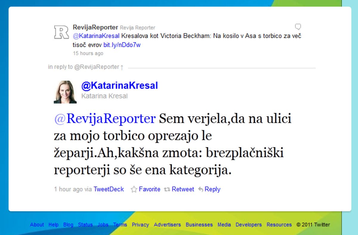 Kresalova je tako danes spet tvitnila po Reporterju: »Sem verjela,da na ulici za mojo torbico oprezajo le žeparji. Ah, kakšna zmota: brezplačniški reporterji so še ena kategorija.« Žiga Turk, nekdanji minister za razvoj v Janševi vladi pa ji je ravno tako po tviterju poslal zanimiv predlog: »Predlagam parlamentarno preiskovalno komisijo o vsakem mediju, ki omeni vaše čevlje, torbice ali uhane.« Mi pa ob tem upamo, da Kresalova, ki se očitno ne spozna samo na drage luksuzne stvari, ampak tudi tudi na brezplačništvo, vsak teden redno kupuje revijo Reporter po ceni 2,70 evra za izvod, in člankov iz tiskane izdaje ne bere brezplačno po zaslugi kakšne kliping agencije, ki nima dovoljenja izdajatelja revije za kopiranje in razpečevanje naših vsebin. Če je temu tako, potem ta agencija to počne nezakonito, saj krši zakonodajo o avtorskih pravicah.
