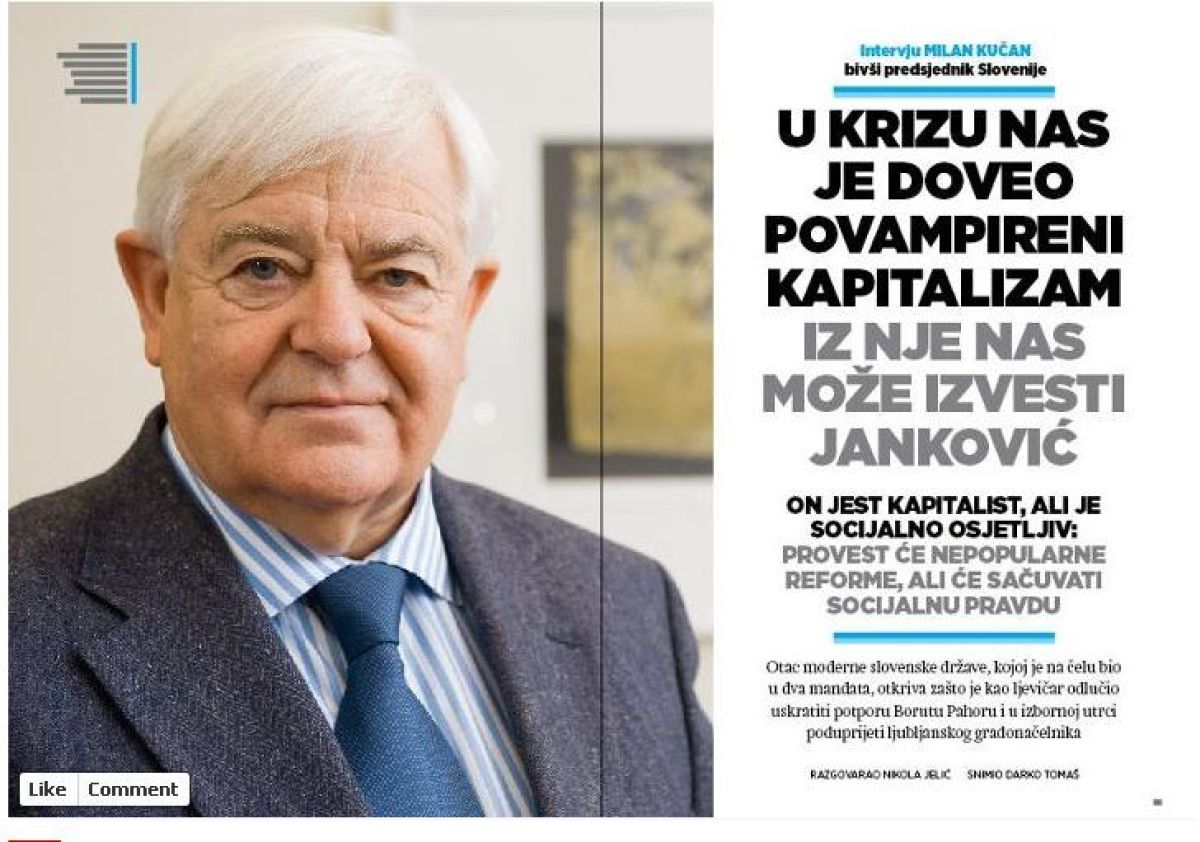 Kriza v Sloveniji ni samo gospodarska, je tudi politična in moralna, in edino Zoran Janković nas lahko potegne iz te krize, razlaga Milan Kučan v intervjuju za hrvaški Globus. Kučan je pojasnil svojo politično reaktivacijo in razloge, da je namesto Pahorja na prihajajočih volitvah podprl Jankoviča.