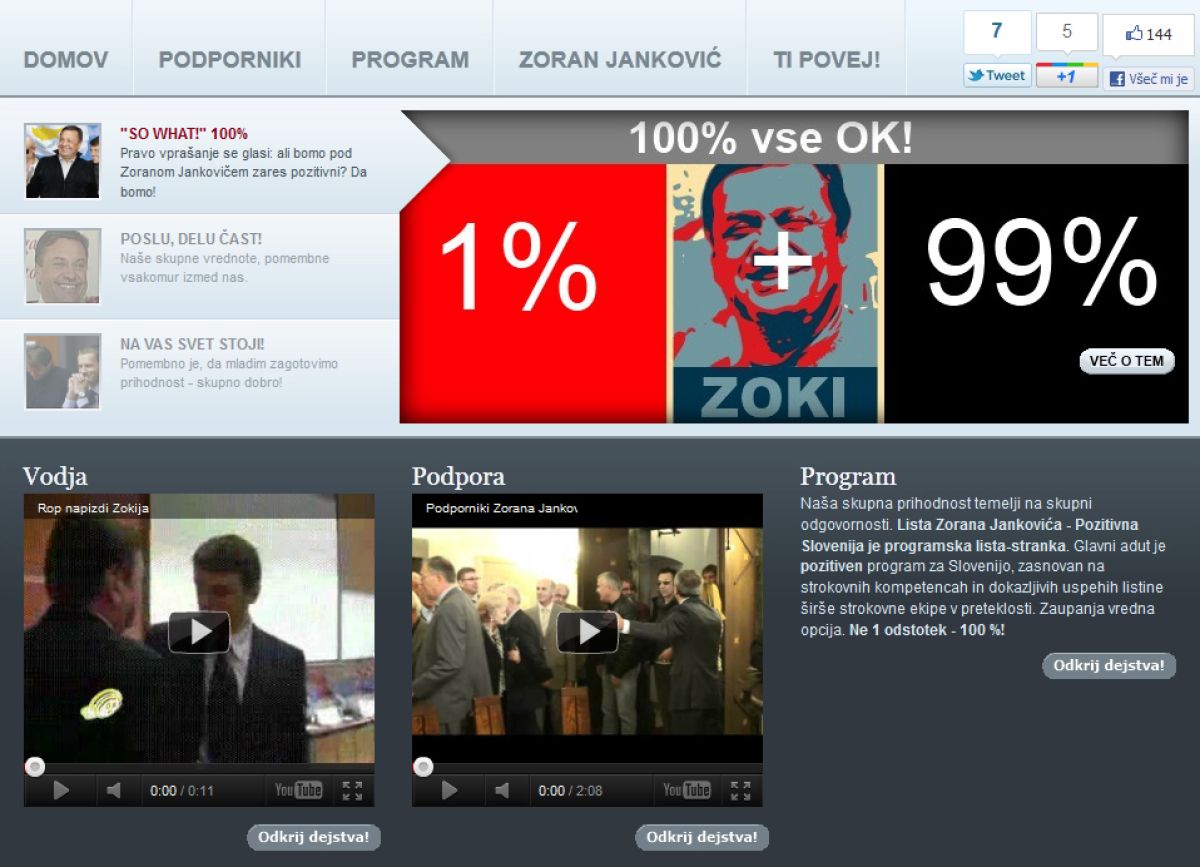 Pravo spletno domeno stranke (PozitivnaSlovenija.si) je sicer že pravočasno registrirala oglaševalska agencija Igorja Ariha, ki dela predvolilno kampanjo za Jankovića, omenjeni naslov pa trenutno vodi na stran zoranjankovic.si.
