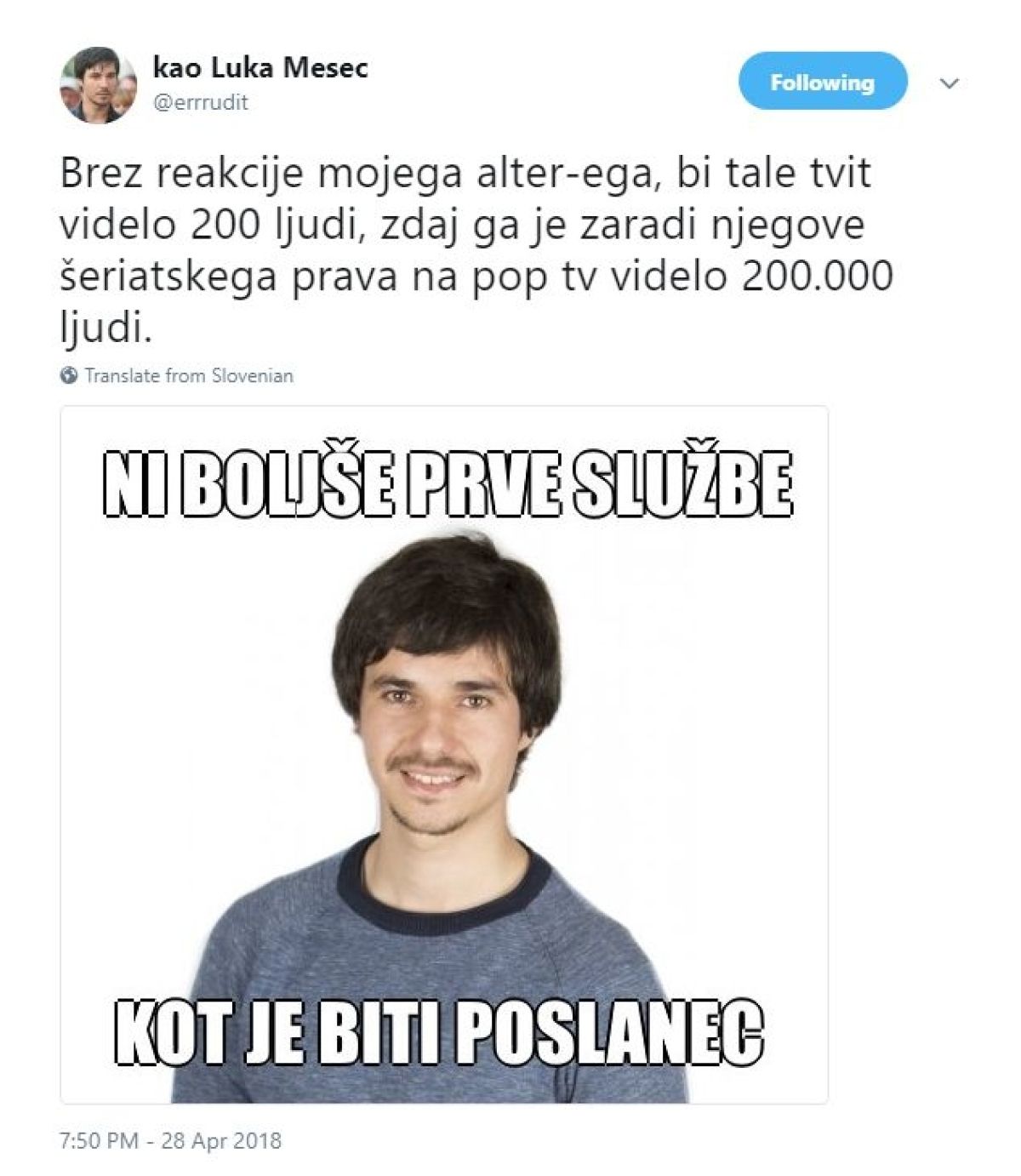 Avtor računa, ki je parodiral Luko Mesca in politiko Levice, je medtem že ustvaril nov račun z imenom »kao Luke Mesec«. Meščeva reakcija in izbris računa sta mu naredila lepo reklamo, je izpostavil: »Brez reakcije mojega alter-ega, bi tale tvit videlo 200 ljudi, zdaj ga je zaradi njegove šeriatskega prava na pop tv videlo 200.000 ljudi.« Šlo je namreč za tvit s fotografijo Luke Mesca in napisom »Ni boljše prve službe kot je biti poslanec.«