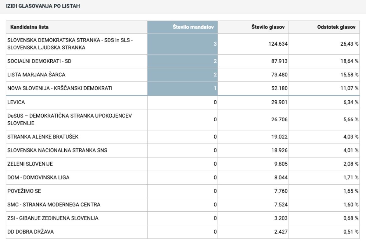 Zmagovalka Evropskih volitev v Sloveniji je skupna lista SDS in SLS, ki je z okoli 26,4 odstotka glasov osvojila tri poslanske mandate. SD je z okoli 18,6 odstotka glasov dobila dva mandata, enako kot LMŠ, ki ji sledi s 15,6 odstotka glasov. En mandat je ohranila NSi, za katero je volilo dobrih 11 odstotkov volivcev.
