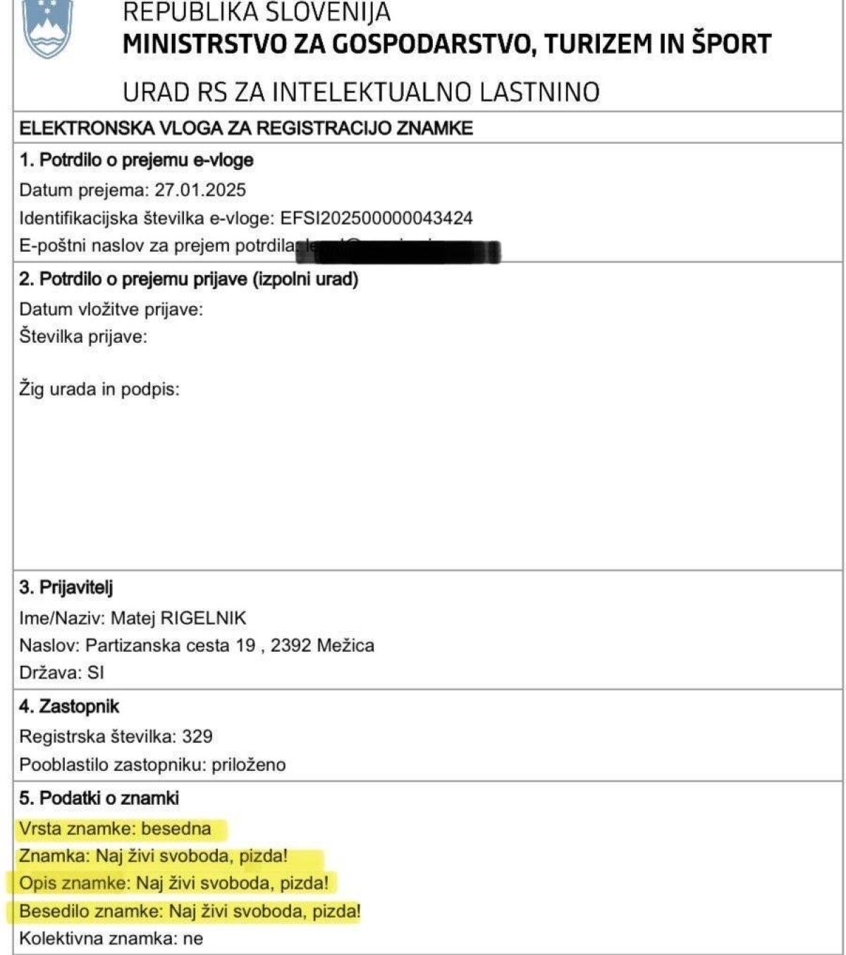 Matej Rigelnik, sin »železnega« Hermana Rigelnika, poskuša uradno registrirati in zaščititi slogan »Naj živi svoboda, pizda!«.