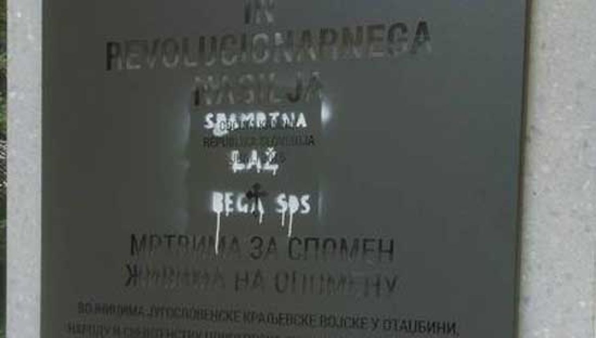 Kot je razvidno iz priložene fotografije, so neznanci k napisu "Vsem žrtvam vojne in revolucionarnega nasilja", kar je citat iz zakona o vojnih grobiščih, pripisali "Sramotna laž bega SDS". Pripis, ki so ga dodali nekoliko nižje, pa je manj čitljiv.