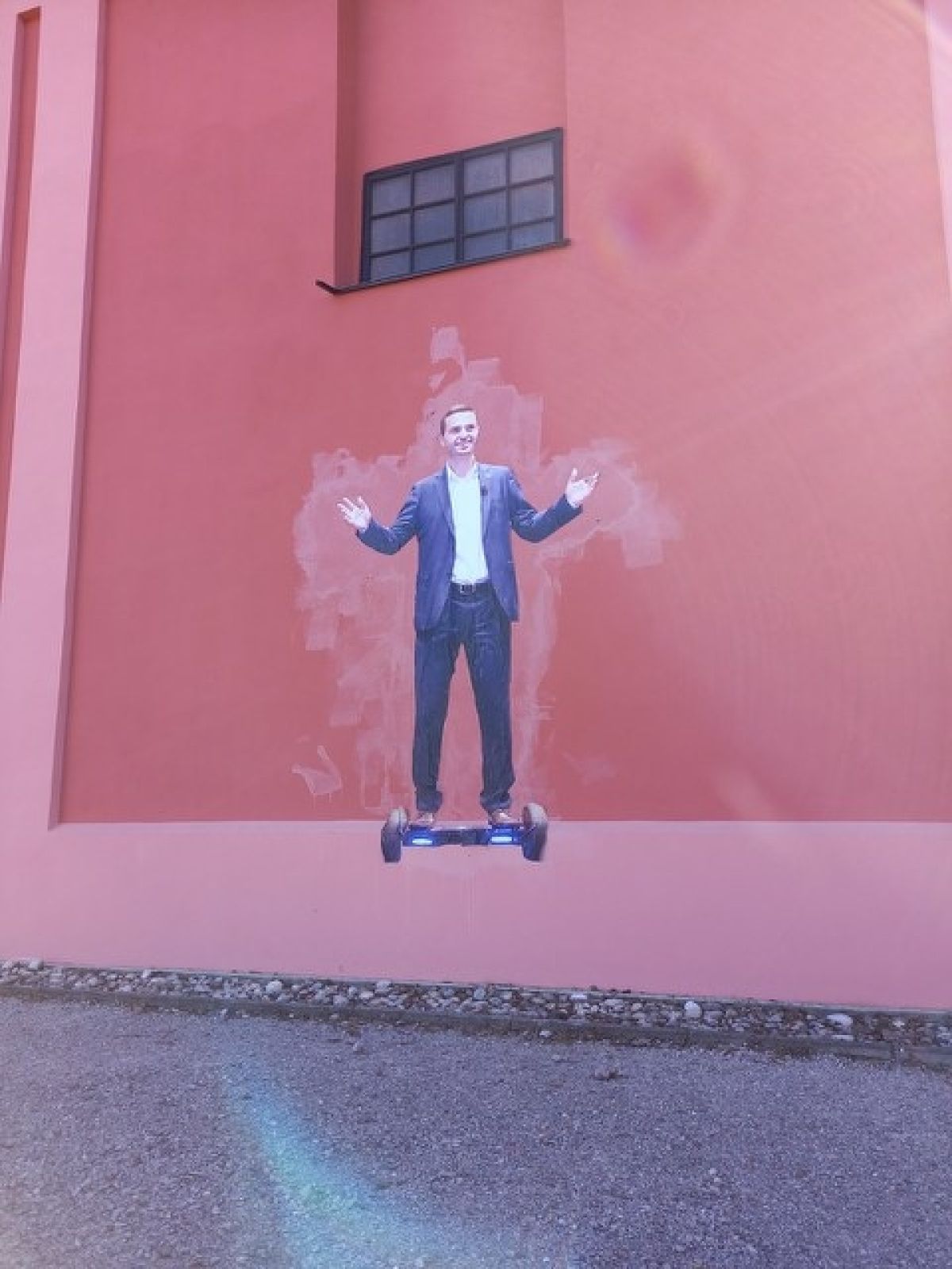Na rdečkasto fasado sakralnega objekta na priljubljeni ljubljanski izletniški točki je tako nekdo nalepil podobo Tonina na električni rolki, s katero je predlani začel nastop na programski konferenci NSi.