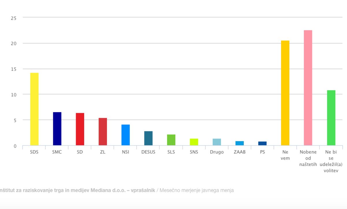 Desetina vprašanih je glede podpore vladi neodločenih. Med strankami prvo mesto ohranja opozicijska SDS, ki bi jo, če bi bile volitve v nedeljo, volilo nekaj več kot 14 odstotkov volivcev. Na drugem mestu je SMC, ki jo podpira 6,5 odstotka vprašanih, sledi pa ji SD. Skok na četrto mesto je uspel ZL, peta je NSi, šesti DeSUS, sedma pa neparlamentarna SLS.
