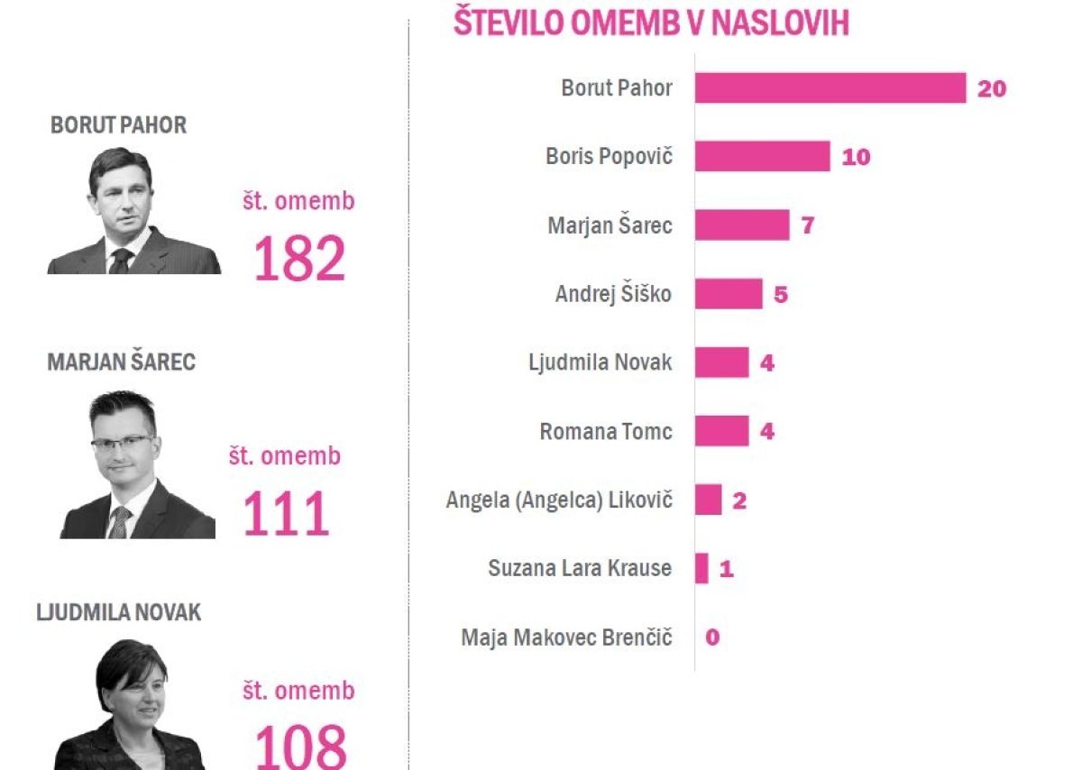 Verjetno ni presenetljivo, da v vseh kategorijah analize prepričljivo vodi predsednik države Borut Pahor. Ta je zbral največ omemb v medijih (skupaj 182) in tudi v naslovih (20). Po številu omemb mu sledi Marjan Šarec (111), ki ima ob tem še sedem omemb v naslovih. Potem so Ljudmila Novak (skupaj 108 omemb in štiri v naslovih), Maja Makovec Brenčič (108, a nič naslovov), Romana Tomc (103, štirje naslove), Boris Popovič (100, deset naslovov), Angelca Likovič (92, dva naslova), Suzana Lara Krause (89, en naslov) in Andrej Šiško (76, pet naslovov).