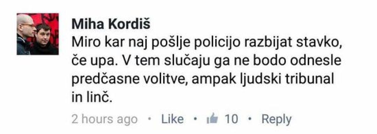 "Miro kar naj pošlje policijo razbijat stavko, če upa. V tem slučaju ga ne bodo odnesle predčasne volitve, ampak ljudski tribunal in linč," je poslanec Združene levice Miha Kordiš na Facebooku zagrozil predsedniku vlade Miru Cerarju. "Ljudje bi ga pregnali z vilami ter postavili pred tribunal," je kasneje dopolnil svoje grožnje zaradi Cerarjevega odziva na dogajanje v Luki Koper.