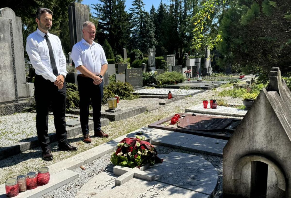 Pokojniku v spomin sta predsednik NSi Matej Tonin in glavni tajnik stranke Robert Ilc na Bajukov grob na ljubljanskih Žalah položila cvetje.