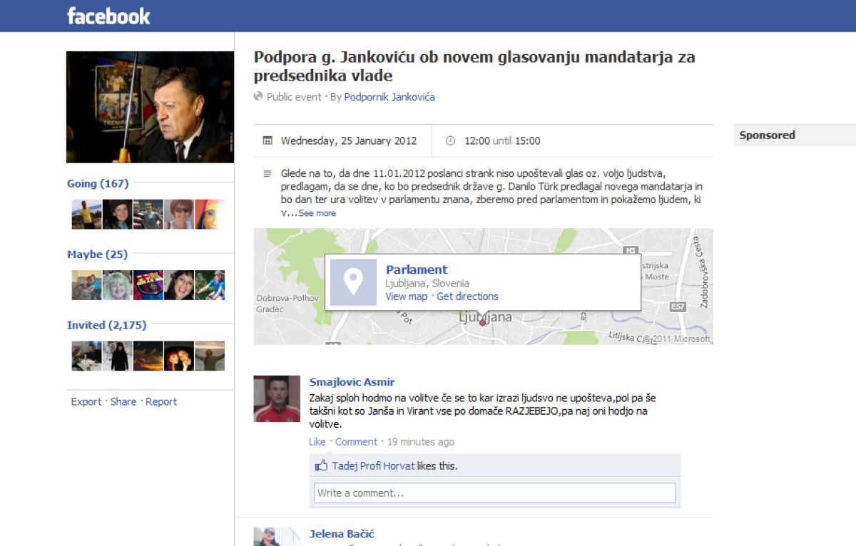 Glede na to, da dne 11.01.2012 poslanci strank niso upoštevali glas oz. voljo ljudstva, predlagam, da se dne, ko bo predsednik države g. Danilo Türk predlagal novega mandatarja in bo dan ter ura volitev v parlamentu znana, zberemo pred parlamentom in pokažemo ljudem, ki vztrajno odklanjajo kakršnokoli sodelovanje z g. Jankovićem, kakšno podporo ima s strani ljudstva, ki je zanj glasovalo že v letu 2011 in se je v letošnjem letu številka še povečala.