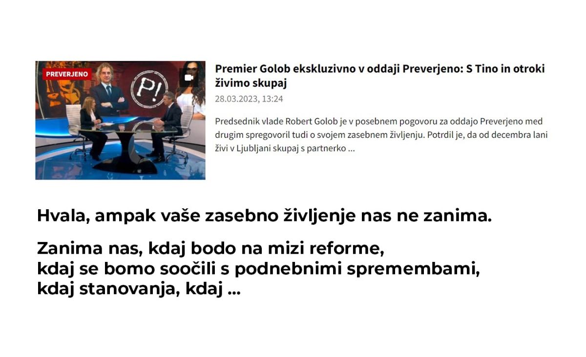 Naj novice preplavijo informacije o reševanju vsega naštetega, namesto zasebnih informacij, ki nikakor ne spadajo v medije v času, ko čakamo drugačno, predvsem pa učinkovitejšo politiko.