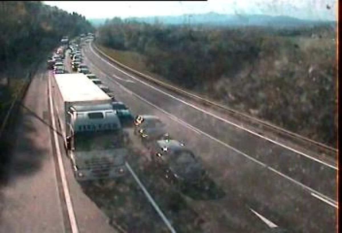 Na dolenjski avtocesti se je pri Šmarju Sap prevrnil tovornjak, nastala je večkilometrska kolona