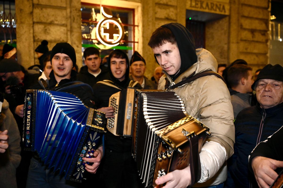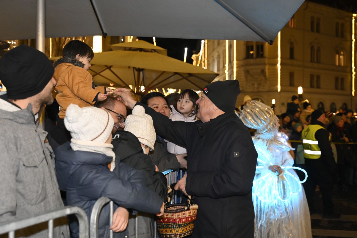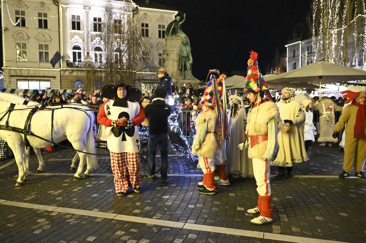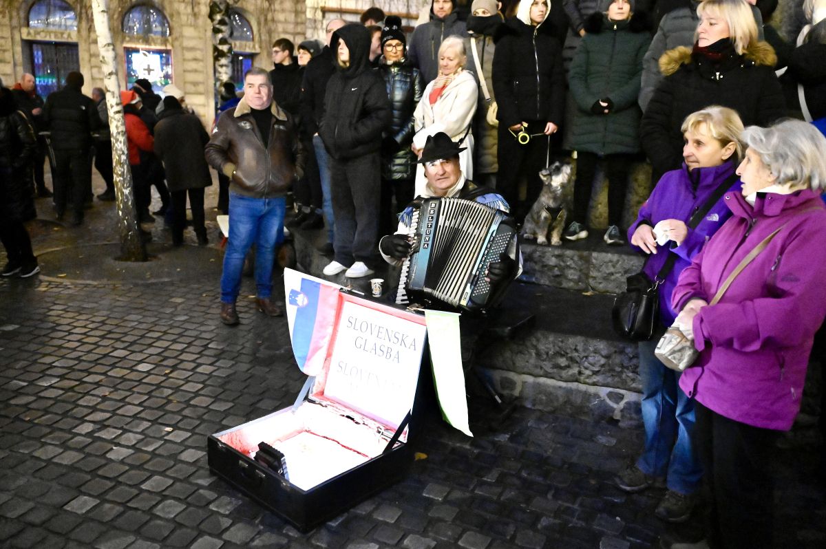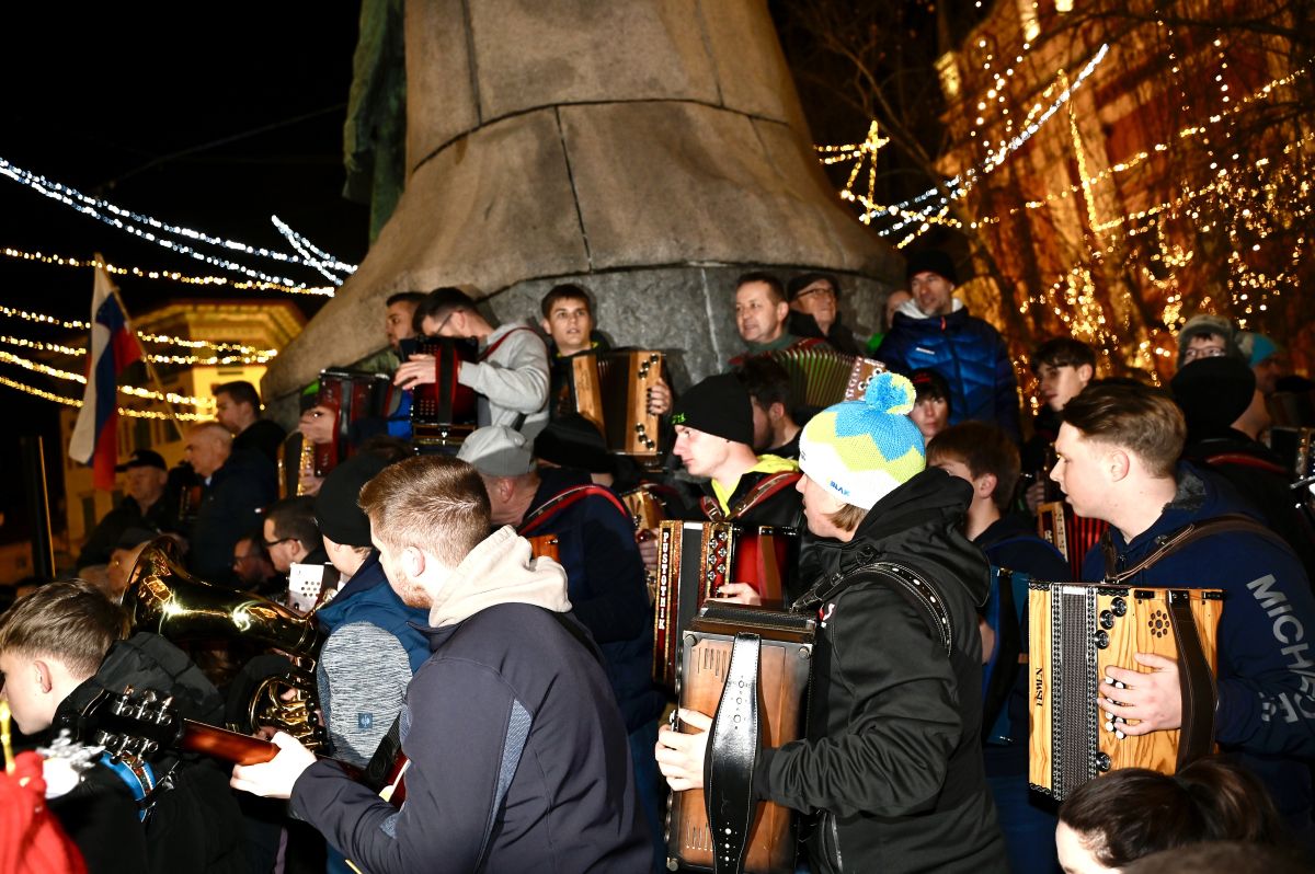 Na Prešernovem trgu se je včeraj zvečer zbrala množica harmonikarjev. Na trgu je bilo moč opaziti plešočega Janeza Janšo, darežljivega Zorana Jankovića in Dedka Mraza.
