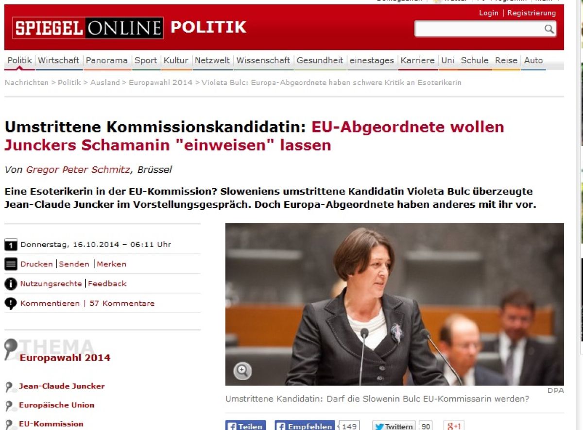 "Junckerjeva šamanka" in "ezoteričarka v Evropski komisiji" so izrazi, s katerimi nemški Spiegel Online začenja svojo današnjo vest o novi komisarski kandidatki iz Slovenije Violeti Bulc.