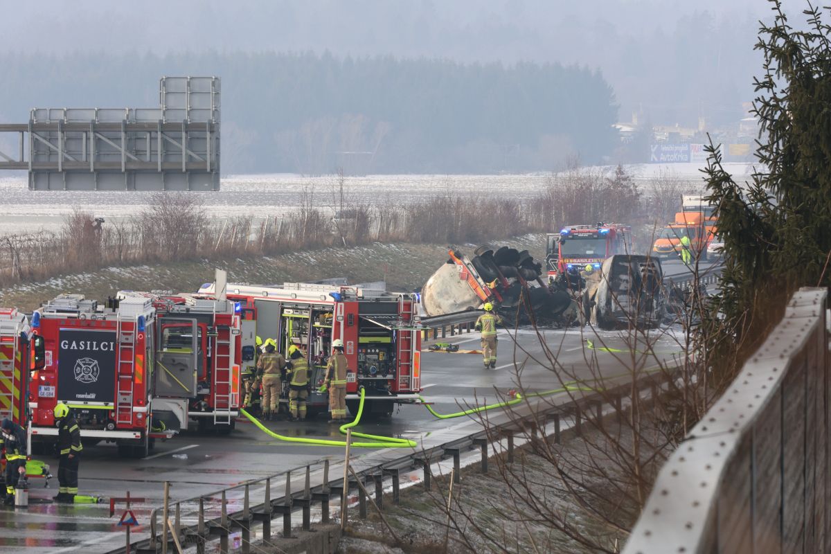 Huda prometna nesreča na štajerski avtocesti pri Slovenski Bistrici: kombi in cisterna zagorela, umrl voznik.