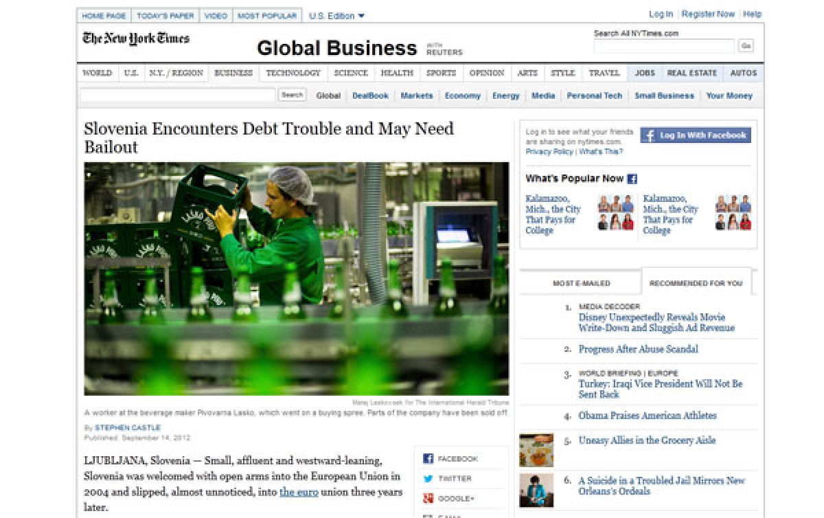 Majhna, premožna in zahodno usmerjena Slovenija je bila z odprtimi rokami sprejeta v EU in kasneje v območje evra. Pet let kasneje pa tej alpski državi z dvema milijonoma ljudi preti sloves prve nekdanje socialistične države v EU, ki bi lahko potrebovala pomoč, v petkovi izdaji piše ameriški časnik The New York Times.