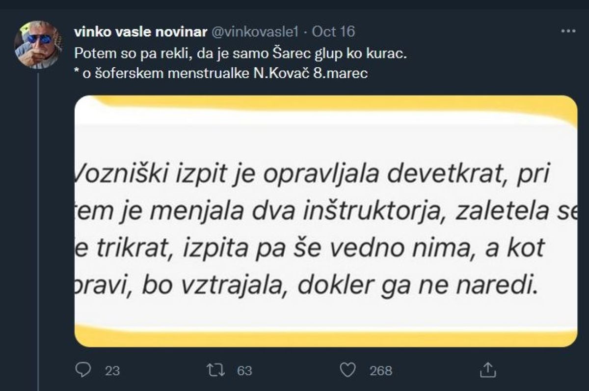 Oglasil se je tudi njen »prijatelj« Vinko Vasle, ki si je s tviti o Kovačevi že nakopal njeno tožbo zaradi razžalitve. Zdaj je tvitnil: »Potem so pa rekli, da je samo Šarec glup ko kurac. *o šoferskem menstrualke N. Kovač 8. marec«.