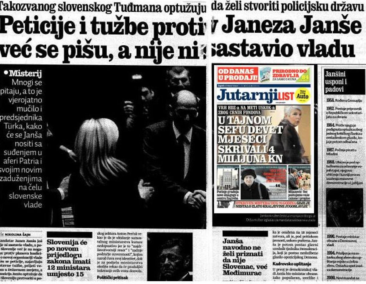 »Mnogi se sprašujejo, kar je verjetno mučilo tudi predsednika Türka, kako bo Janša lahko opravljal obveznosti predsednika vlade, hkrati pa se udeleževal sojenja v aferi Patria,« se začne članek, ki ga je danes objavil Jutarnji list z nadnaslovom Tako imenovanega slovenskega Tuđmana obtožujejo, da želi ustvariti policijsko državo oziroma naslovom Peticije in tožbe proti Janeza Janše se že pišejo, čeprav še ni sestavil vlade. V članku opisuje proteste zaradi združevanja nekaterih ministrstev in prenosa državnega tožilstva pod notranje ministrstvo ter morebitno glasovanje državnih svetnikov o vetu na zakon o vladi.