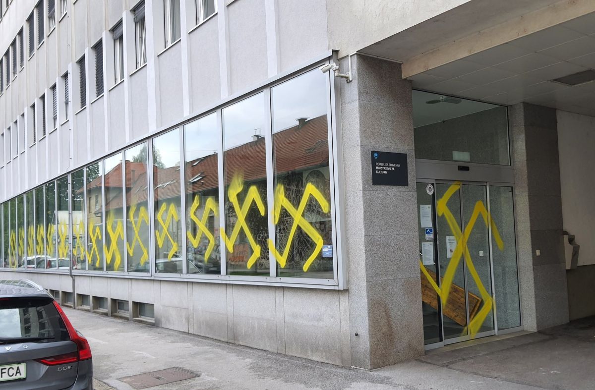 »Ponoči so nekulturni neznanci davkoplačevalcem ponovno povzročali škodo,« je kulturno ministrstvo na twitterju objavilo fotografije s kljukastimi križi porisane stavbe ministrstva.