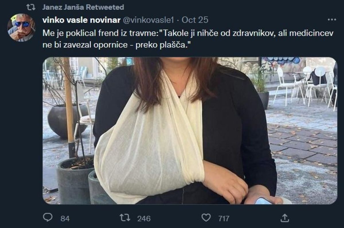 Upokojeni novinar Vinko Vasle je k fotografiji Nike Kovač z roko v opornici napisal: »Me je poklical frend iz travme: 'Takole ji nihče od zdravnikov, ali medicincev, ne bi zavezal opornice – prek plašča.'« Nedolgo zatem je Milenko Ziherl. »Me je poklical frend iz travme: 'Takole ji nihče od zdravnikov, ali medicincev, ne bi zavezal opornice – prek plašča.'«