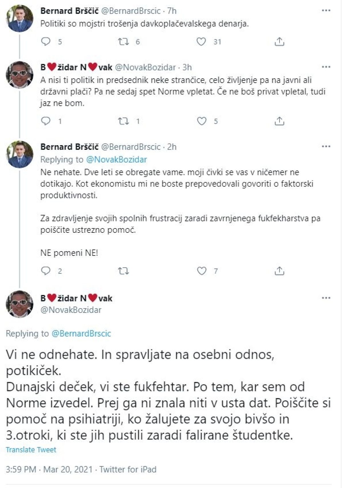 Po tem, ko je Bršič včeraj tvitnil "Politiki so mojstri trošenja davkoplačevalskega denarja," se je hitro odzval Novak, ki je Bršiču, tako kot že pred dnevi, očital, da je "politik in predsednik neke strančice, celo življenje pa na javni ali državni plači".