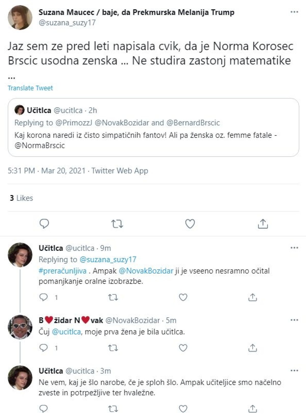 Nadaljevalo se je obračunavanje na Twitterju med Božidarjem Novakom in Bernardom Brščičem, ki je znova zašlo na intimno raven. Na tapeti je bila znova Brščičeva soproga Norma Brščič.