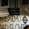 Na včerajšnjem protestu v Novem mestu je skupina skrajnežev razvila transparent Defend Slovenija, pa ga nato tudi hitro pospravila/skrila.