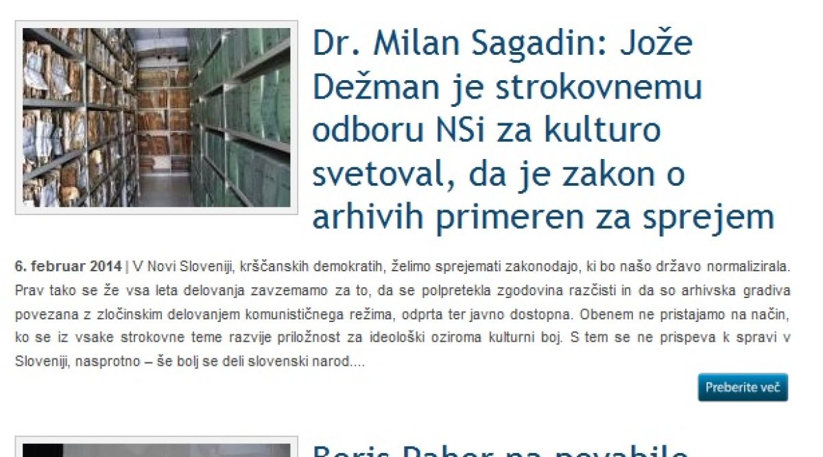 Objavljamo polemiko med nekdanjim direktorjem Arhiva Jožetom Dežmanom in predsednikom odbora za kulturo NSI Milanom Sagadinom. Potem ko je Jože Dežman za spletni portal reporter.si zanikal, da je NSI priporočil sprejetje novele zakona o arhivih, se je na spletni strani NSI.si oglasil njihov predsednik odbora za kulturo dr. Jože Sagadin in ga obtožil zavajanja. Prav tako tudi Vladimirja Žumerja, direktorja Arhiva pred desetimi leti, ki se je tako kot Dežman ogradil od sprejete novele. Objavljamo tudi Dežmanov odgovor Sagadinu, v katerem ponavlja, da je pri pripravi novele sodeloval le pred vložitvijo v parlamentarno proceduro, pozneje pa ne.