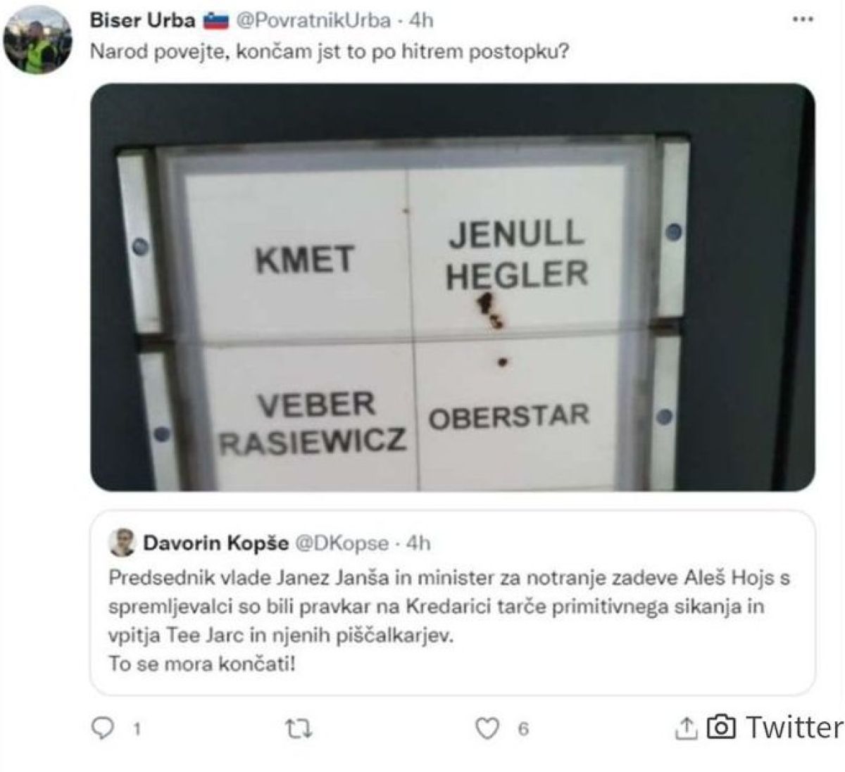 Vidni član petkovega protestnega gibanja Jaša Jenull je policiji prijavil tvit predsednika Društva za promocijo tradicionalnih vrednot Urbana Purgarja, v katerem je ta objavil fotografijo izpred Jenullovega doma in pripisal: "Narod povejte, končam jaz to po hitrem postopku?". Gre za povsem direktno grožnjo, menijo v Protestni ljudski skupščini.