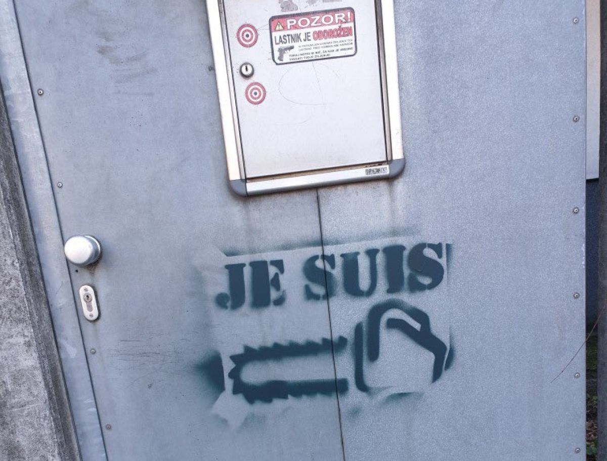 Na vratih hiše predsednika SNS Zmaga Jelinčiča se je v teh dneh pojavil grafit z napisom "Je suis" in podobo motorne žage. Prvak SNS je fotografijo v torek objavil na Twitterju. Gre sicer za še eno v vrsti vandalskih akcij, uperjenih proti vidnim predstavnikom politike in civilne družbe v zadnjem času.