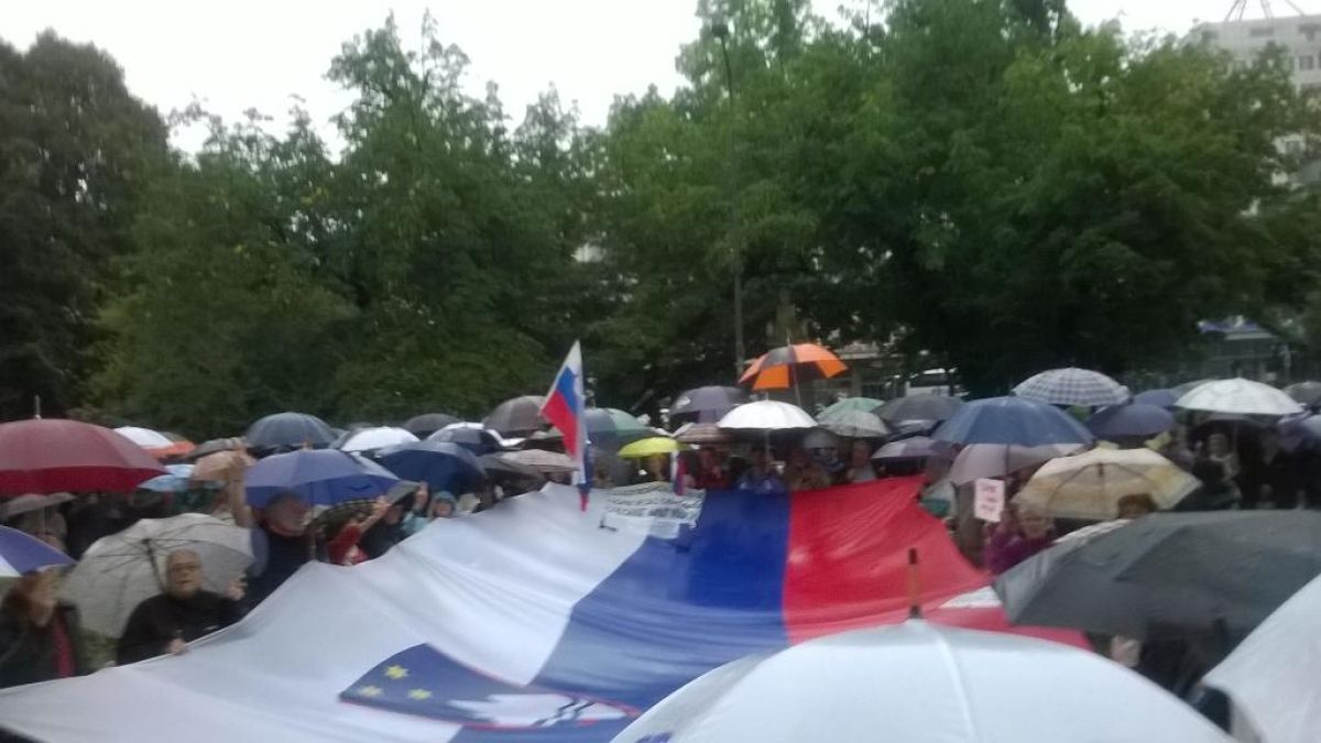 "Naša simbola sta slovenska in evropska zastava," pravi Karmen Kozmus, ki dodaja: "Tukaj stojim, ker zelim pravično Slovenijo. Janšo so po nedolžnem zaprli, ker se bojijo izgube lastnih privilegijev."