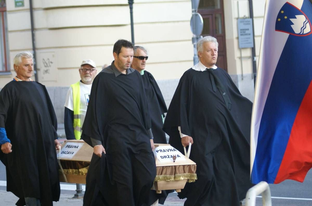 "Pravna država ni umrla naravne smrti, ampak so jo ubili. Niso je ubili naenkrat, ampak so jo desetletja strahovito mučili, se izživljali nad njo ter jo zlorabljali tudi za nezakonito in protiustavno obsojanje, zapiranje, mučenje – tudi za ubijanje nedolžnih žrtev. Ob tem je neizmerno trpela in krvavela," so iz Odbora 2014 sporočili od današnjem simbolčnem pogrebu pravne države pred vrhovnim sodiščem v Ljubljani.