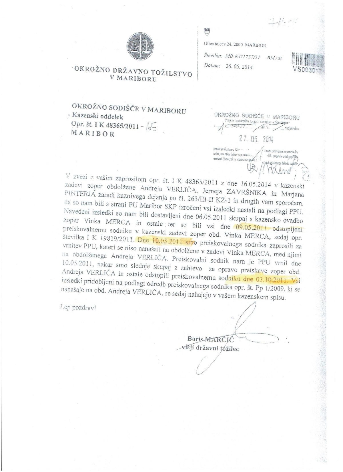 V naših preteklih obvestilih smo vas že obveščali o tem, da je dne 23. 07. 2010, Elizabeta Györkös, takratna vodja mariborskih tožilcev, od policije zahtevala poročilo o uporabi ukrepov, ne pa kazensko ovadbo. Dne 26. 07. 2010, je navedena vodja mariborskega tožilstva, v skladu z ZKP-jem predala vse PPU-je v preizkus zakonitosti, takratnemu sodniku dr. Janezu ŽIROVNIKU. Od dne 26. 07. 2010, bi se morali vsi ukrepi iz naslova PPU hraniti samo na sodišču, pri preiskovalnemu sodniku. Kako je sploh mogoče, da je sodišče takratnemu tožilcu Borisu MARČIČU dovolilo, da je vse PPU ukrepe v zadevi Franc KANGLER, odnesel z mariborskega sodišča? S tem je sodišče nedvomno ravnalo nezakonito. S tem pa se pojavi velika verjetnost, in tudi dvom v samo pristnost dokazov, da je tožilec sodni spis dopolnjeval, prilagajal, itd. Ugotovljeno je bilo tudi, da je takratni preiskovalni sodnik dr. Janez ŽIROVNIK preizkus zakonitosti opravljal na podlagi treh (3x) kopij DVD-jev in ne originalov. V Odboru 2015 se sprašujemo kje so originali? Prav tako pa smo preko obdolženega Franca KANGLERJA ugotovili, da do tega trenutka ni bila ugotovljena korespondenca predaje spisa in vseh listin PPU z dne 10. 05. 2011, s strani preiskovalnega sodnika v Mariboru, takratnemu tožilcu Borisu MARČIČU.