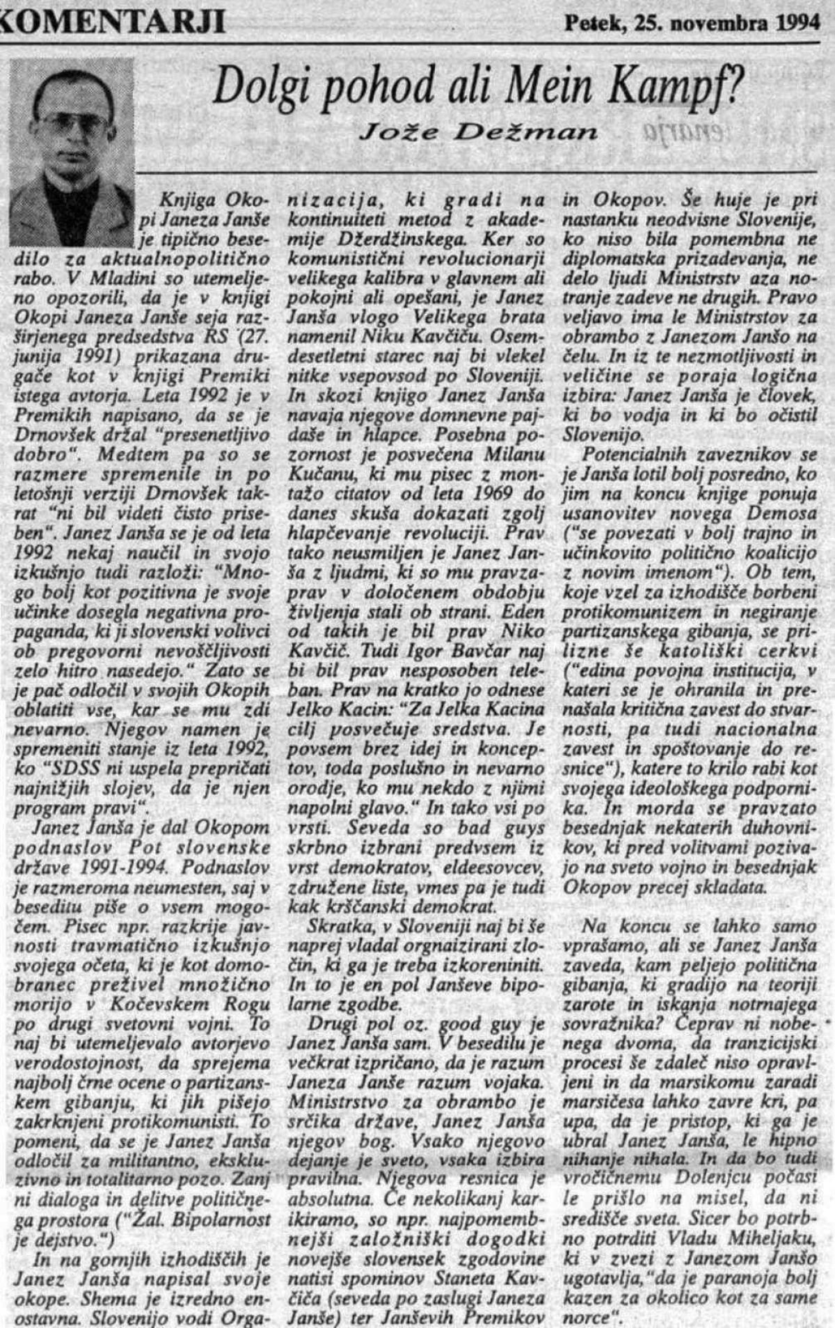 V komentarju z naslovom Dolgi pohod ali Mein Kampf je raztrgal knjigo Okopi Janeza Janše. Med drugim piše, da se je Janša s knjigo odločil za militantno, ekskluzivno in totalitarno pozo ter da zanj ni dialoga in delitve političnega prostora.