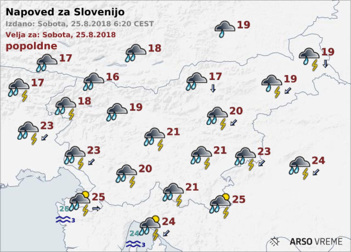 Danes bo pretežno oblačno s pogostimi padavinami. Vmes bodo nevihte s krajevno močnejšimi nalivi. Popoldanske temperature bodo od 16 do 21, ob morju in v Beli krajini še okoli 24 °C.