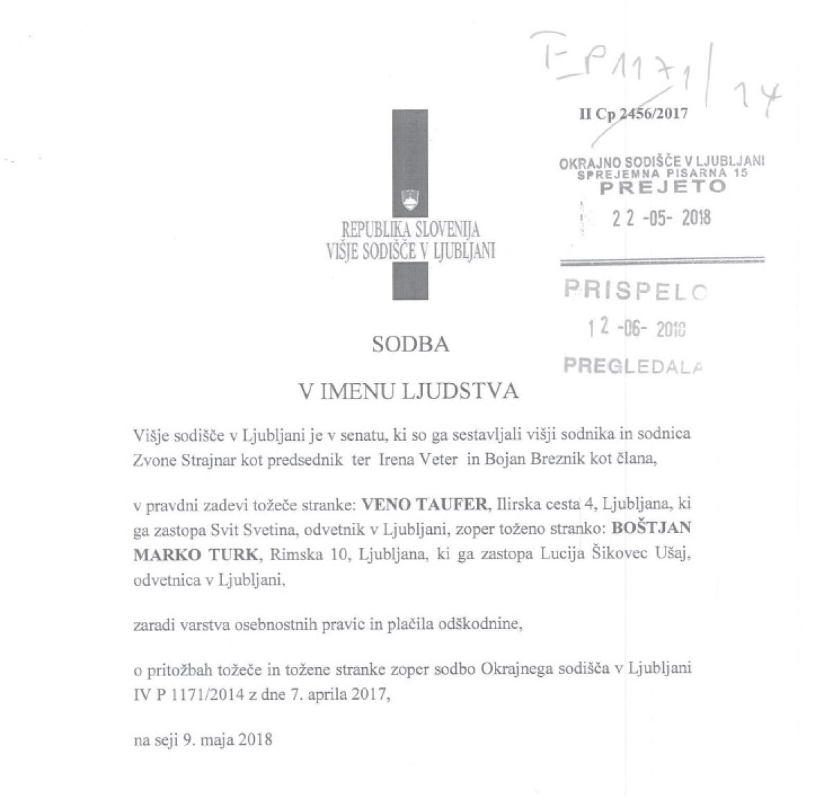 SODBA V IMENU LJUDSTVA IN SKLEP Okrajno sodišče v Ljubljani je v pravdni zadevi opr. št.: IV P 1171/2014 tožeče stranke: Veno Taufer, ki ga zastopa odvetnik Svit Svetina iz Ljubljane zoper toženo stranko: Boštjan Marko Turk, ki ga zastopa odvetnik Radovan Cerjak iz Ljubljane, zaradi varstva osebnostnih pravic in plačila odškodnine, dne 7.4.2017 odločilo: