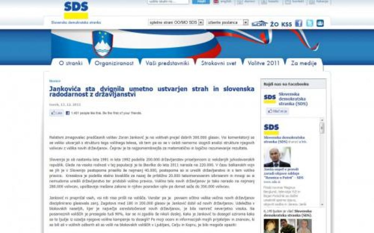 Izjavljam, da sem avtor/ica članka z naslovom "Jankovića sta dvignila umetno ustvarjen strah in slovenska radodarnost z državljanstvi", ki je objavljen na spletni strani SDS. Članek sem napisal/a zato, ker sem želel/a javnost opozoriti na nekatera zaskrbljujoča dejstva, o katerih drugi molčijo. Želel/-a sem namreč opozoriti, da je nedopustno strašiti ljudi z odvzemom državljanstva v primeru zmage SDS na državnozborskih volitvah, saj je državljanstvo trajna pravica, ki je ni moč odvzeti. Javnost sem prav tako želel/-a opozoriti, da je tudi nedopustno strašenje z odvzemom pokojnin, saj so te prav tako trajna pravica in plačilo za minulo delo. Zloraba veteranskih organizacij, ki se financirajo z davkoplačevalskim denarjem iz proračuna Republike Slovenije, za politično propagando je zato vsega obsojanja vredna, še posebej, če v njihovih propagandih gradivih piše, da bosta Janša in SDS jemala pokojnine.