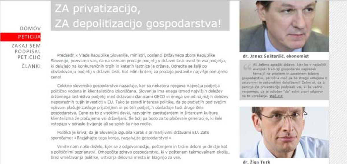 Ponosni smo, da so našo pobudo za privatiazicjo in depolitizacijo slovenskega gospodarstva podprli tudi izjemno uspešni podjetnik Marjan Batagelj, predsednik Svetovnega slovenskega kongresa dr. Boris Pleskovič in ekonomist dr. Sašo Polanec.