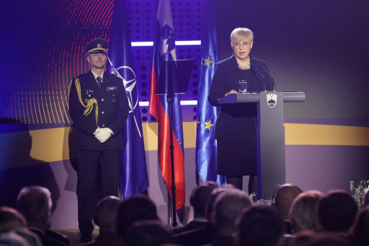 "Naše vrednote in mednarodnopravne norme so pod vse večjim pritiskom," je posvarila. Kot je dodala, ni več humanosti, vrednote pa ne štejejo nič. Je pa prepričana, da ima Slovenija "z varnostnim dežnikom kolektivne obrambe največje jamstvo za stabilnost in varnost". Ker pa to po njenih besedah ni samoumevno, moramo biti pozorni na uravnoteženo delitev bremen, tesno obrambno sodelovanje in realne zmogljivosti.