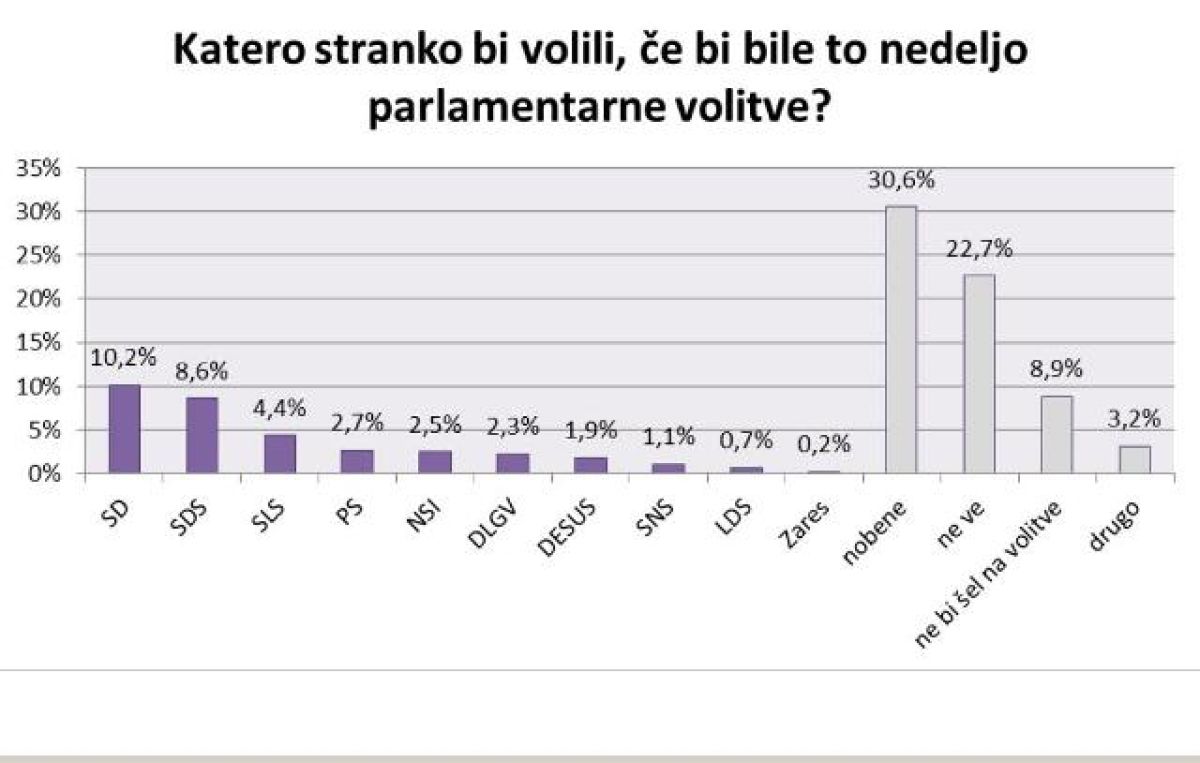 Če bi bile v nedeljo parlamentarne volitve, bi 10,2 odstotka vprašanih volilo stranko SD, 8,6 odstotka stranko SDS, 4,4 odstotka pa SLS, kažejo rezultati ankete Slovenski utrip, ki jo je izvedla Fakulteta za uporabne družbene študije (FUDŠ) v Novi Gorici. Na četrtem mestu je Pozitivna Slovenija z 2,7 odstotka.
