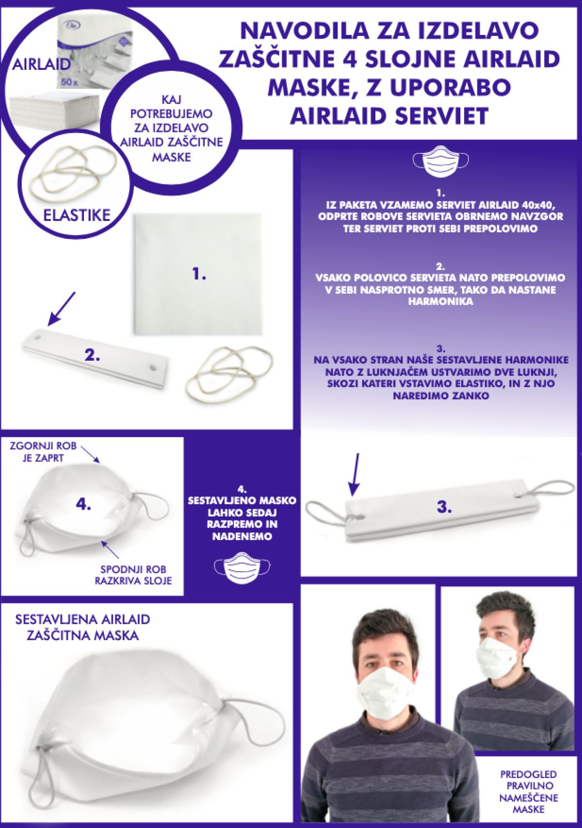 Kje teh mask ne moremo uporabiti? Aleš Šarec pojasnjuje, da maske iz air laid servieta niso primerne za zdravstveno uporabo. Ne morejo nadomestiti kirurške in medicinske maske, prav tako jih ne moremo uporabiti namesto mask, ki so v uporabi v lakirnici avtomobilov. Velja še opozorilo, da mask iz serviete ne smemo odvreči v odtoke po uporabi, ker niso razgradljive in bomo z njimi zamašili odtoke. Prav tako jih ne smemo odvreči med papirne odpadke, saj niso izdelane iz papirja, pač pa med mešane.