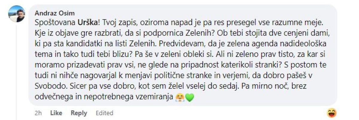 Osim ji je odgovoril v komentarju pod njeno objavo na facebooku: »Spoštovana Urška! Tvoj zapis, oziroma napad je pa res presegel vse razumne meje. Kje iz objave gre razbrati, da si podpornica Zelenih? Ob tebi stojita dve cenjeni dami, ki pa sta kandidatki na listi Zelenih. Predvidevam, da je zelena agenda nadideološka tema in tako tudi tebi blizu? Pa še v zeleni obleki si. Ali ni zeleno prav tisto, za kar si moramo prizadevati prav vsi, ne glede na pripadnost katerikoli stranki? S postom te tudi ni nihče nagovarjal k menjavi politične stranke in verjemi, da dobro pašeš v Svobodo. Sicer pa vse dobro, kot sem želel vselej do sedaj. Pa mirno noč, brez odvečnega in nepotrebnega vzemiranja.«