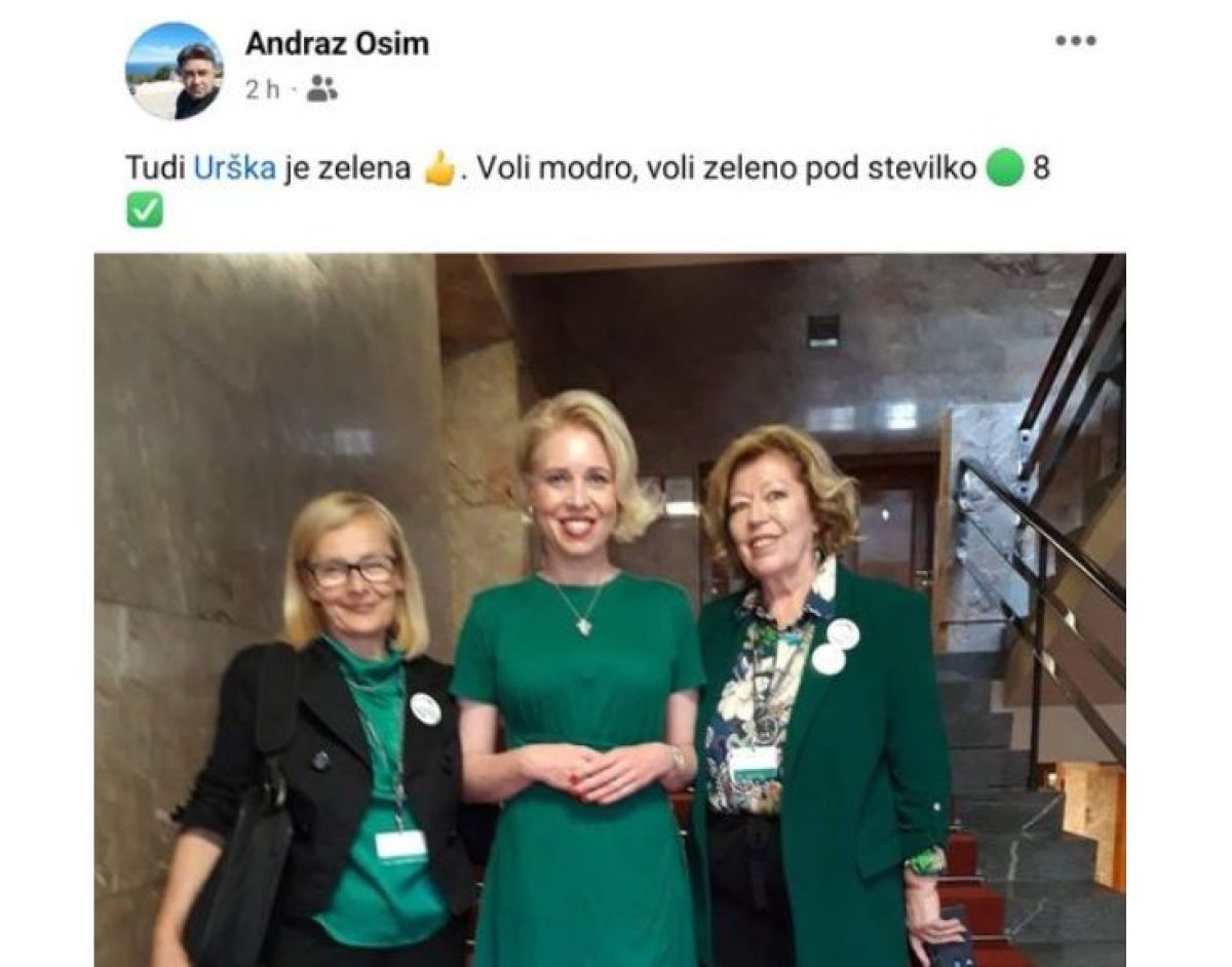 Njeno fotografijo v zeleni obleki in v družbi podpredsednice stranke Zelenih Slovenije Nade Pavšer in sociologinje Valerija Korošec, obeh kandidatk Zelenih za evropski parlament, je na facebooku objavil njen bivši sodelavec in nekdanji član Gibanja Svoboda Andraž Osim, ki je zraven pripisal: »Tudi Urška je zelena. Voli modro, voli zeleno pod številko 8.«