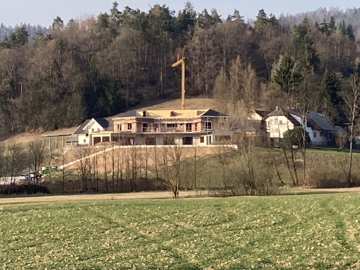Kot je bil decembra, je tudi še zdaj nepremičnina v lasti podjetja Global Med, ki je enako kot Medicoengineering v lasti omenjenih zakoncev. Nanjo je bila julija lani vpisana hipoteka v korist Sberbank za 650 tisoč evrov, dospe čez tri leta. Gradnja pospešeno poteka, vila dobiva projektirano obliko, razvidno je, da bo šlo za objekt z ogromno teraso. Že na daleč dominira nad tamkajšnjo dolino.