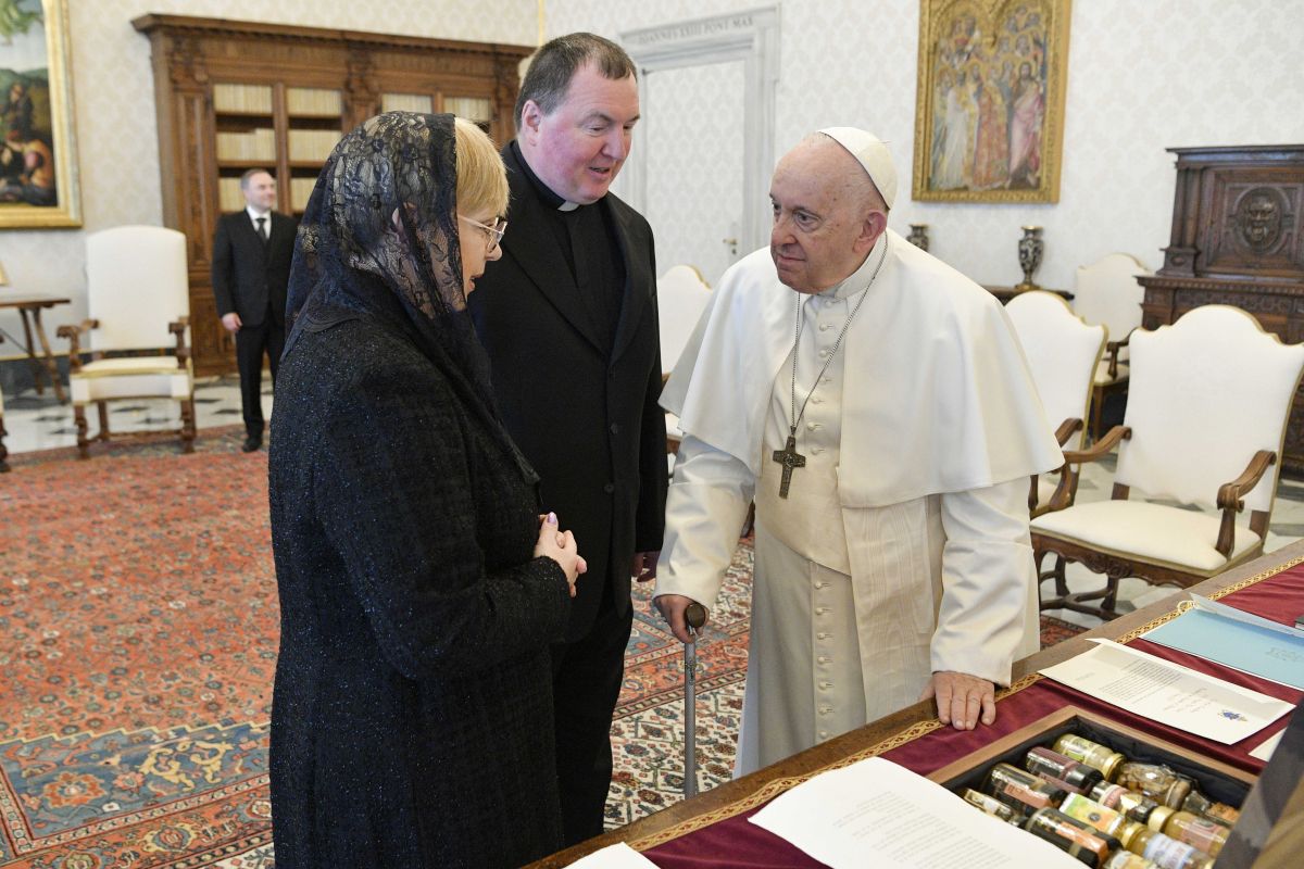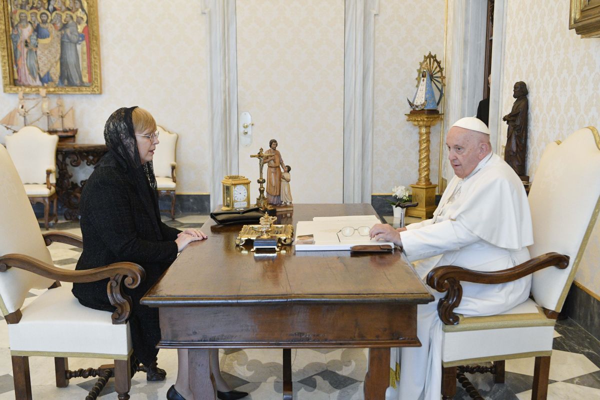 Predsednica republike Nataša Pirc Musar in papež Frančišek sta se danes na pogovorih v Vatikanu zavzela za strpen dialog in spodbujanje politik, ki povezujejo. Pozornost sta po navedbah predsedničinega urada namenila tudi Ukrajini, kjer mora po njunem mnenju priti do trajnega in pravičnega miru, ter podnebnim spremembam.